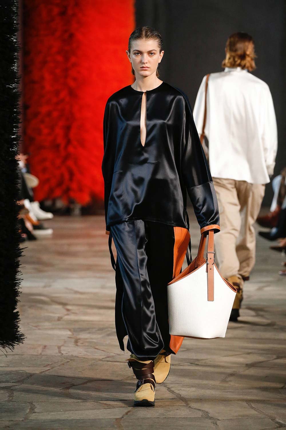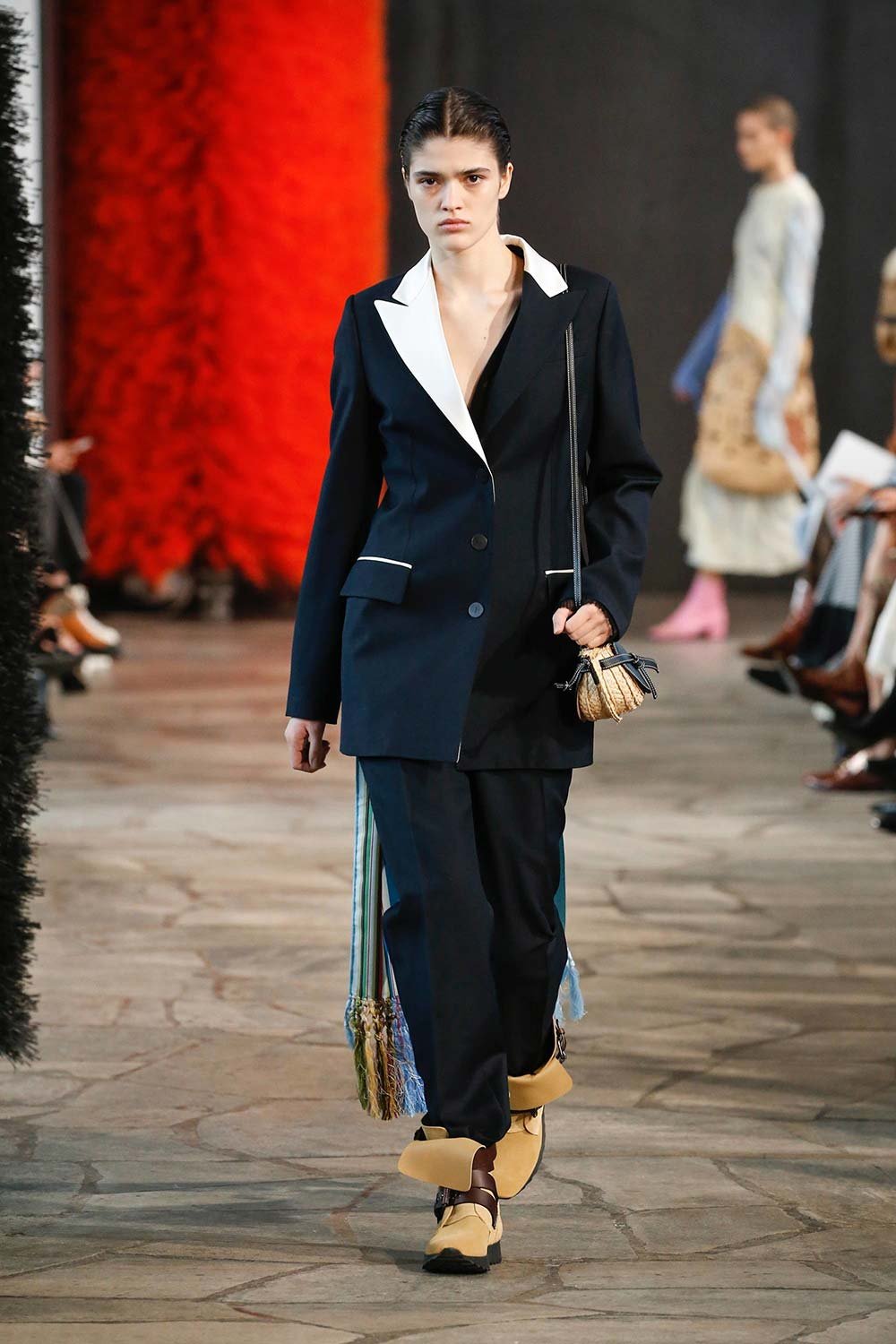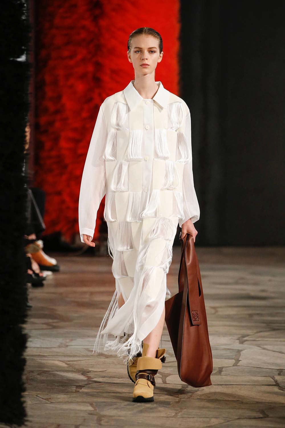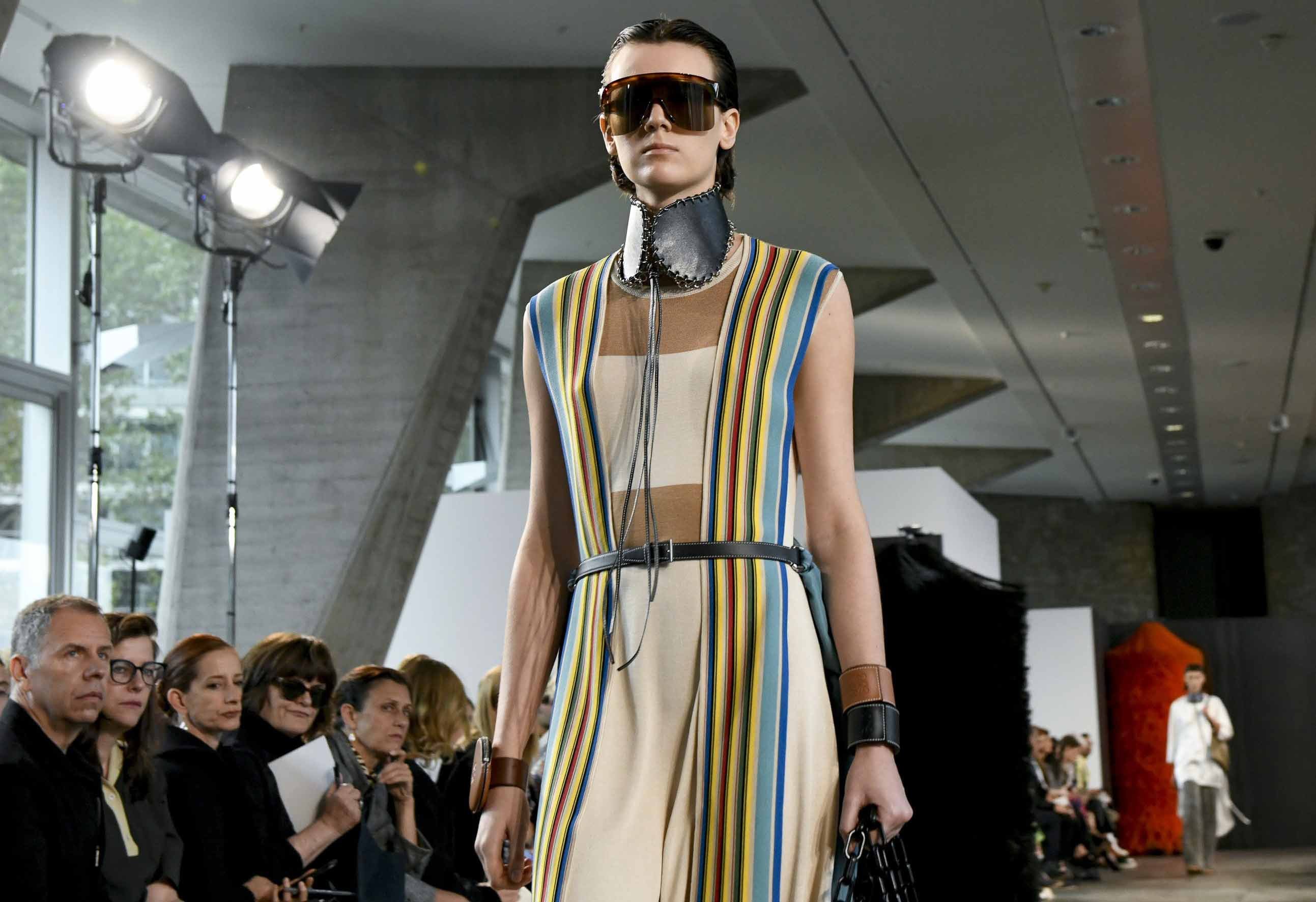 Jonathan Anderson’ın Loewe için hazırladığı 2019 İlkbahar/Yaz tasarımları UNESCO miras binasında yer alan üç çağdaş sanatçının eserleri arasında sergilendi. Satenin ağırlığı hissedilmekle beraber bohem tekstilin yoğun olduğu bir şovdu bu. Örme kumaşlar ve rahat kesimler herkes için giyilebilir bir moda vaat ediyordu. Kıyafetler aslında sıra dışıydı ama tasarımcının hedefi, herkesi ortak bir paydada buluşturan o sihirli ipliği yakalamaktı. Ve bunu da başardı. Totemik olarak nitelendirdiği saçaklı hasır çantalar ve tüy detaylarsa görünümlerin enerjisini yükseltmek ve onlara Loewe DNA’sı kazandırmak için başroldeydi.