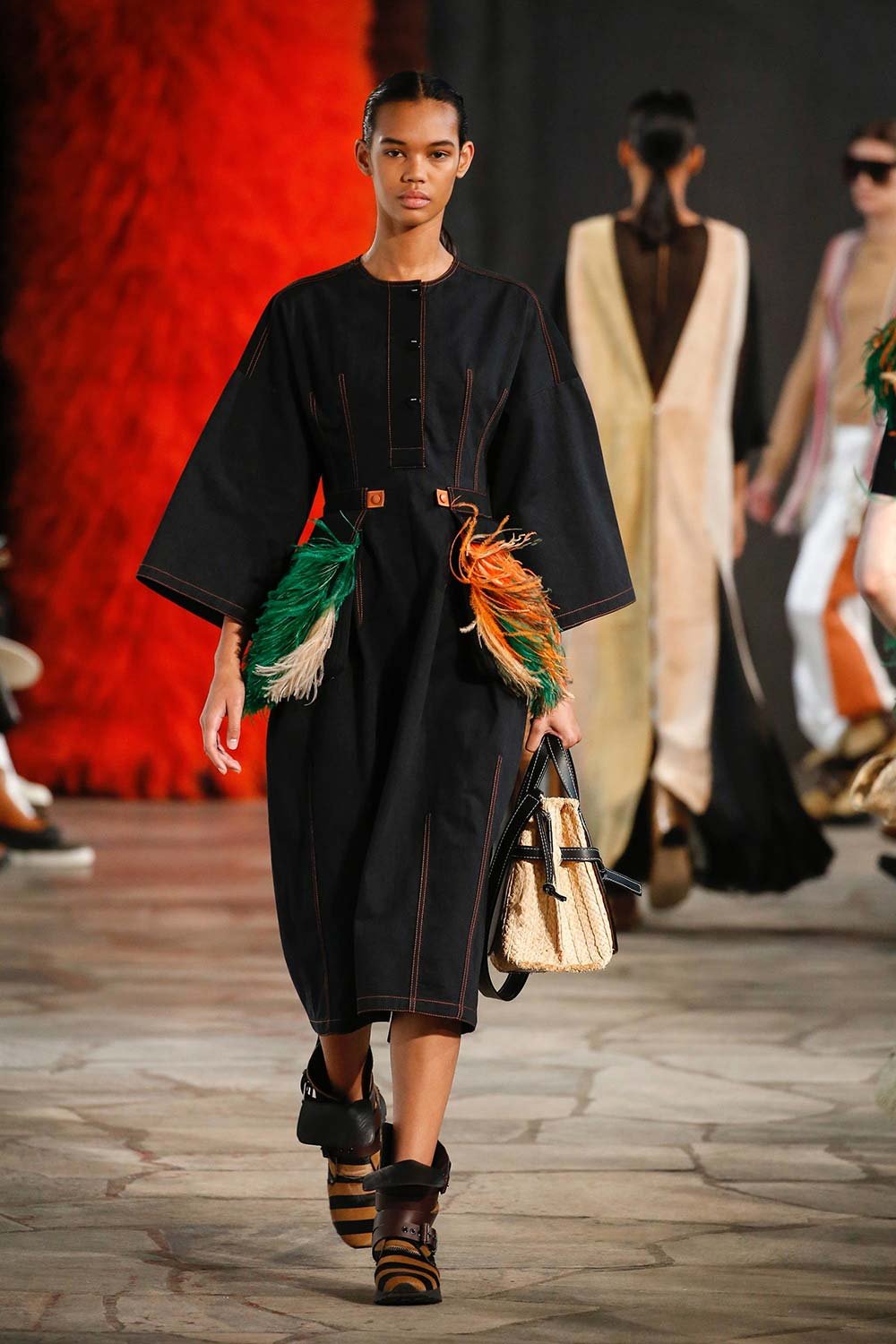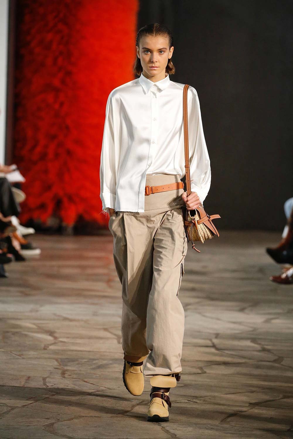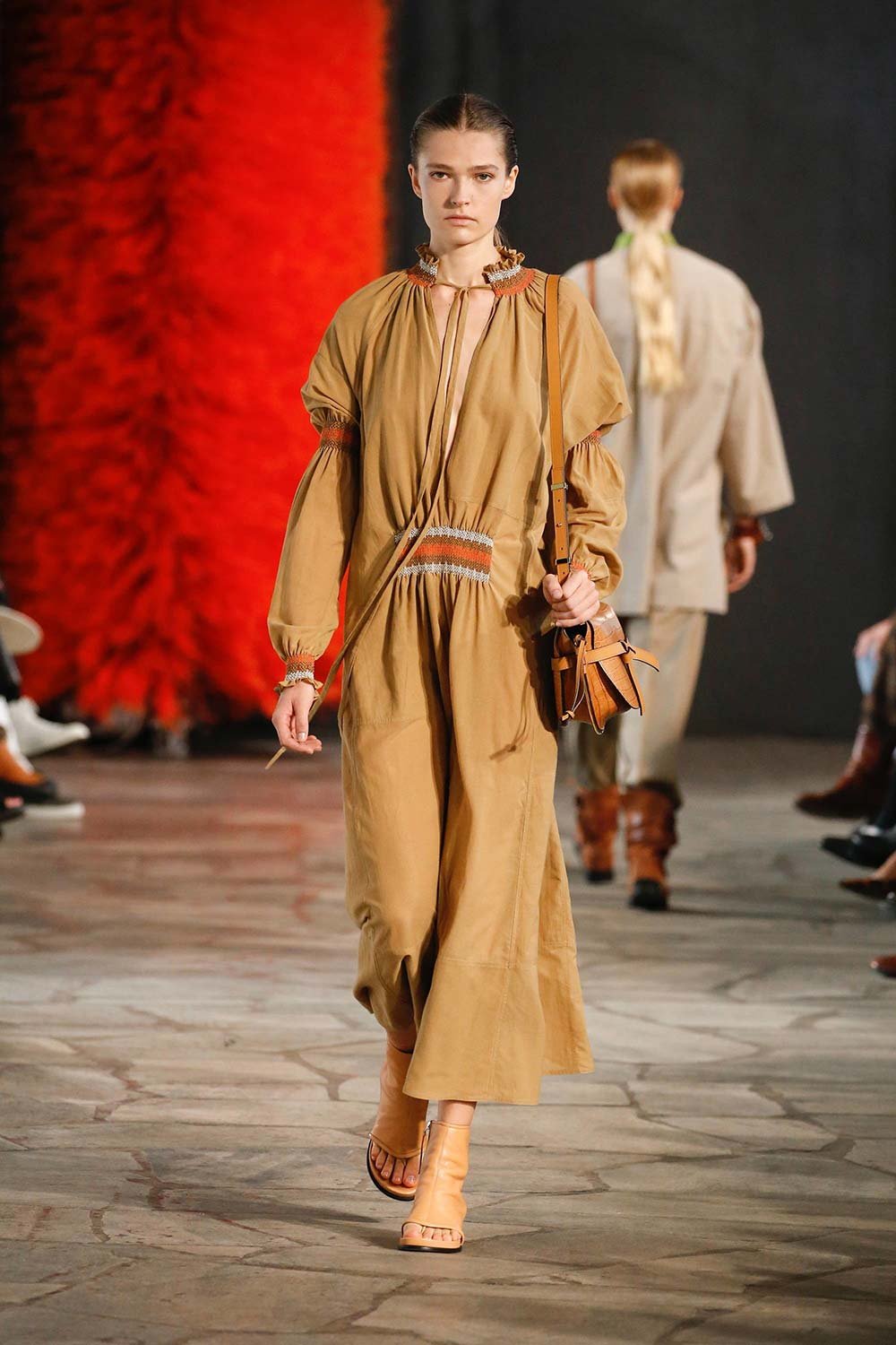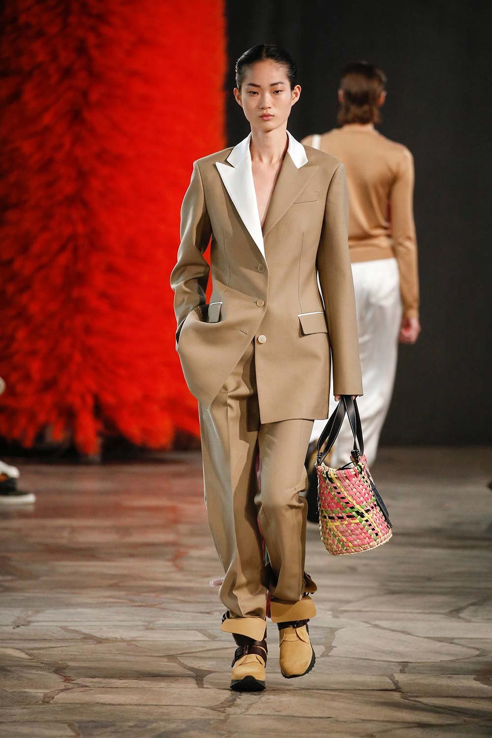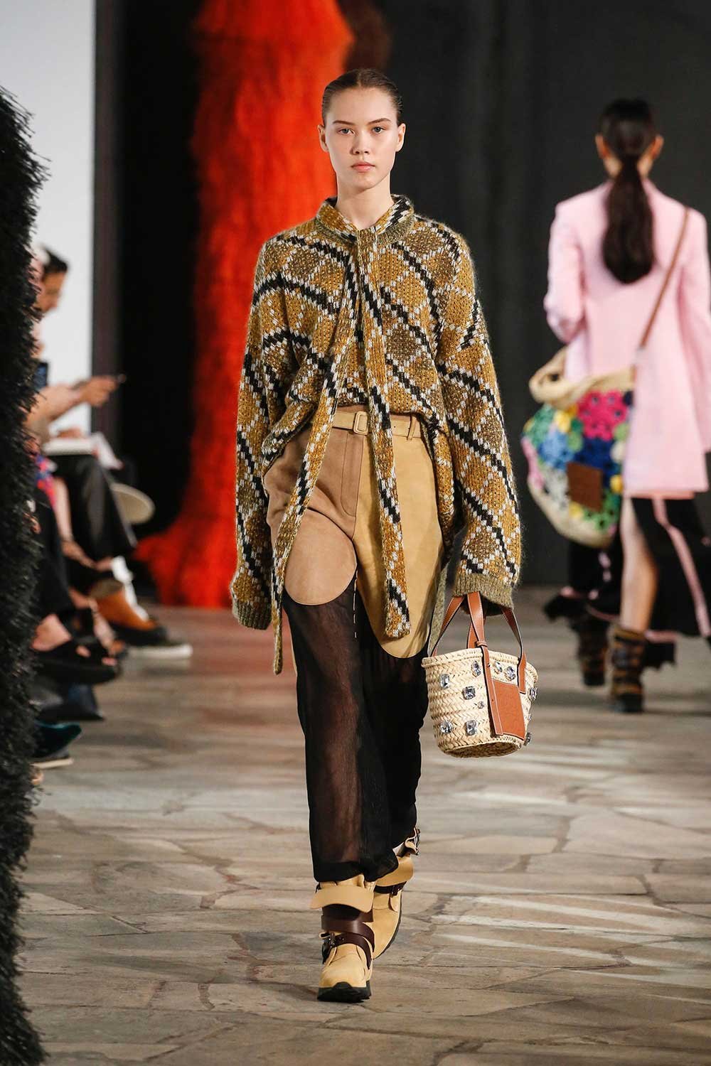 Jonathan Anderson’ın Loewe için hazırladığı 2019 İlkbahar/Yaz tasarımları UNESCO miras binasında yer alan üç çağdaş sanatçının eserleri arasında sergilendi. Satenin ağırlığı hissedilmekle beraber bohem tekstilin yoğun olduğu bir şovdu bu. Örme kumaşlar ve rahat kesimler herkes için giyilebilir bir moda vaat ediyordu. Kıyafetler aslında sıra dışıydı ama tasarımcının hedefi, herkesi ortak bir paydada buluşturan o sihirli ipliği yakalamaktı. Ve bunu da başardı. Totemik olarak nitelendirdiği saçaklı hasır çantalar ve tüy detaylarsa görünümlerin enerjisini yükseltmek ve onlara Loewe DNA’sı kazandırmak için başroldeydi.