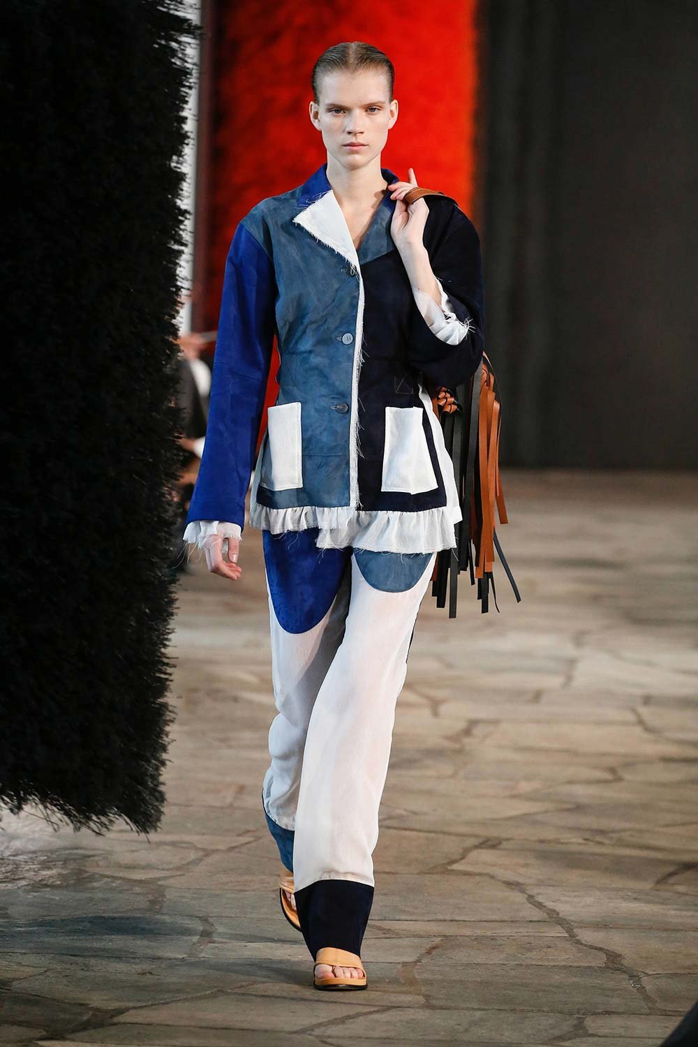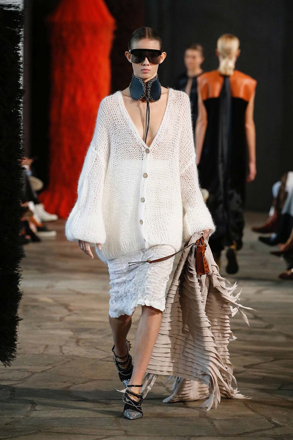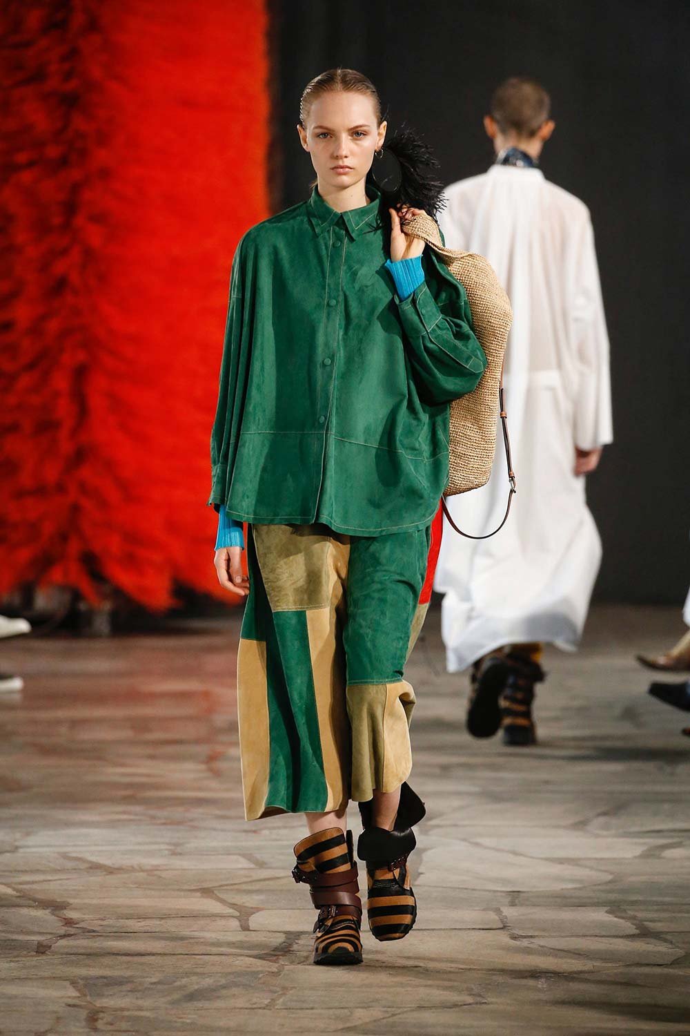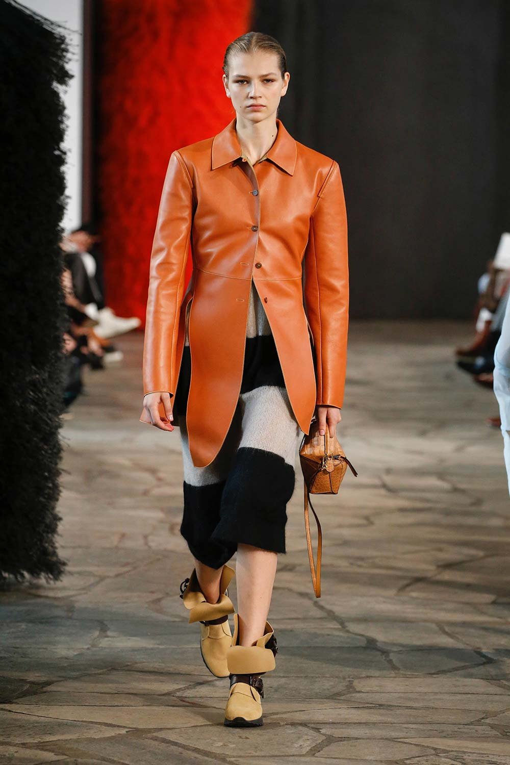 Jonathan Anderson’ın Loewe için hazırladığı 2019 İlkbahar/Yaz tasarımları UNESCO miras binasında yer alan üç çağdaş sanatçının eserleri arasında sergilendi. Satenin ağırlığı hissedilmekle beraber bohem tekstilin yoğun olduğu bir şovdu bu. Örme kumaşlar ve rahat kesimler herkes için giyilebilir bir moda vaat ediyordu. Kıyafetler aslında sıra dışıydı ama tasarımcının hedefi, herkesi ortak bir paydada buluşturan o sihirli ipliği yakalamaktı. Ve bunu da başardı. Totemik olarak nitelendirdiği saçaklı hasır çantalar ve tüy detaylarsa görünümlerin enerjisini yükseltmek ve onlara Loewe DNA’sı kazandırmak için başroldeydi.