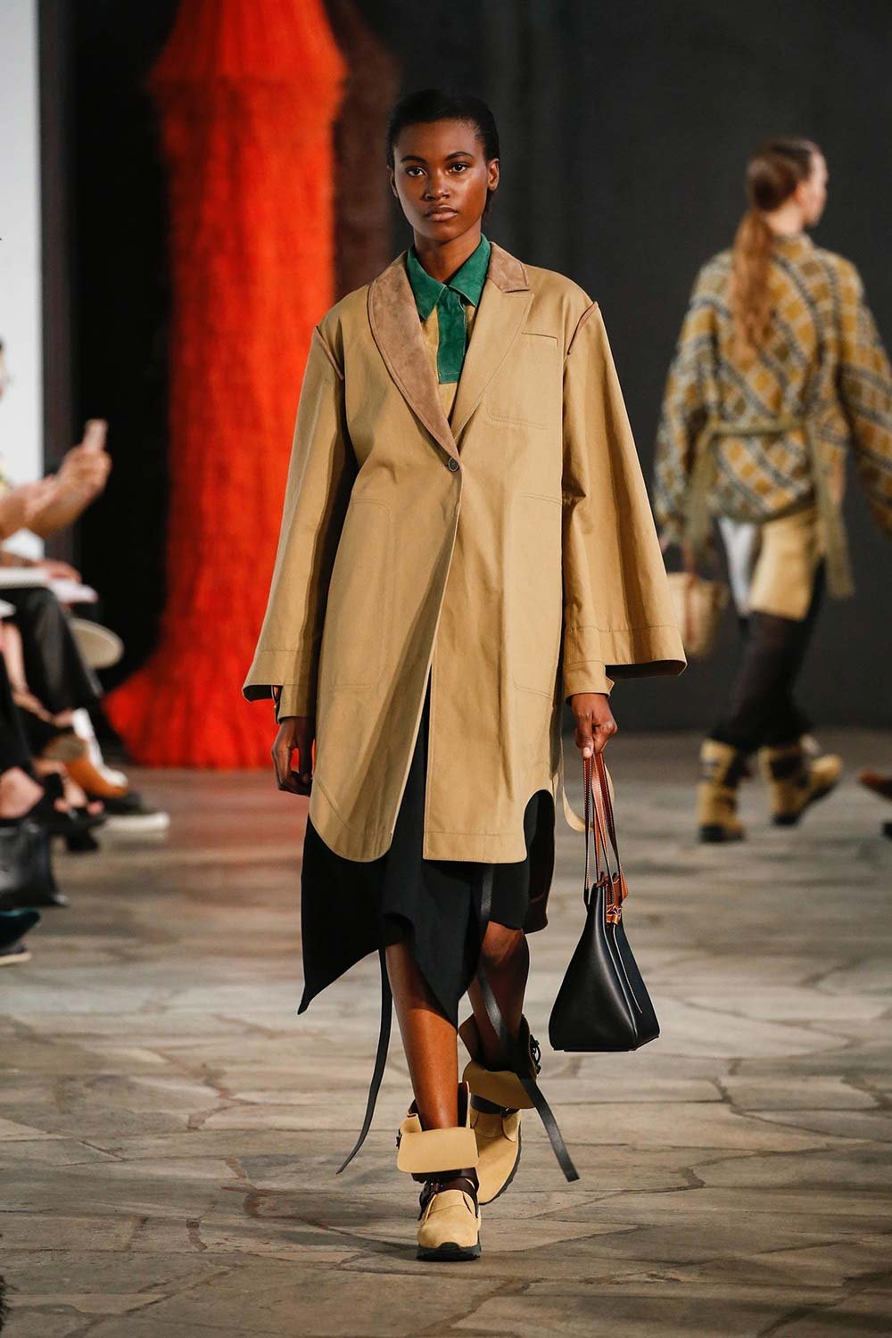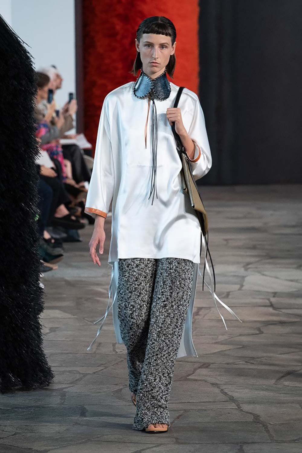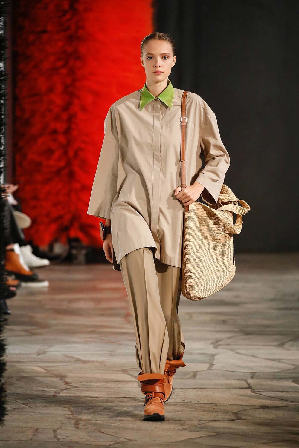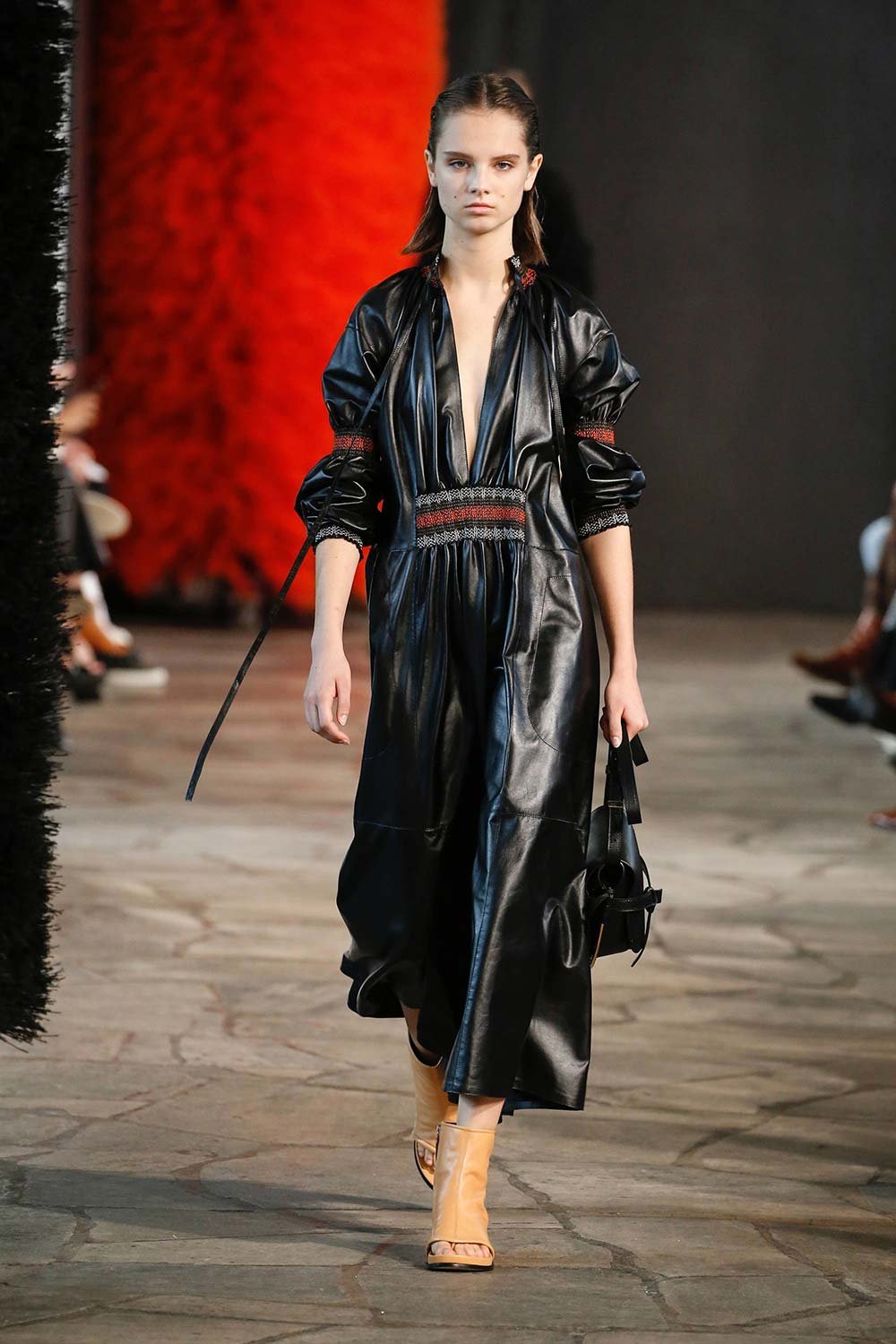 Jonathan Anderson’ın Loewe için hazırladığı 2019 İlkbahar/Yaz tasarımları UNESCO miras binasında yer alan üç çağdaş sanatçının eserleri arasında sergilendi. Satenin ağırlığı hissedilmekle beraber bohem tekstilin yoğun olduğu bir şovdu bu. Örme kumaşlar ve rahat kesimler herkes için giyilebilir bir moda vaat ediyordu. Kıyafetler aslında sıra dışıydı ama tasarımcının hedefi, herkesi ortak bir paydada buluşturan o sihirli ipliği yakalamaktı. Ve bunu da başardı. Totemik olarak nitelendirdiği saçaklı hasır çantalar ve tüy detaylarsa görünümlerin enerjisini yükseltmek ve onlara Loewe DNA’sı kazandırmak için başroldeydi.